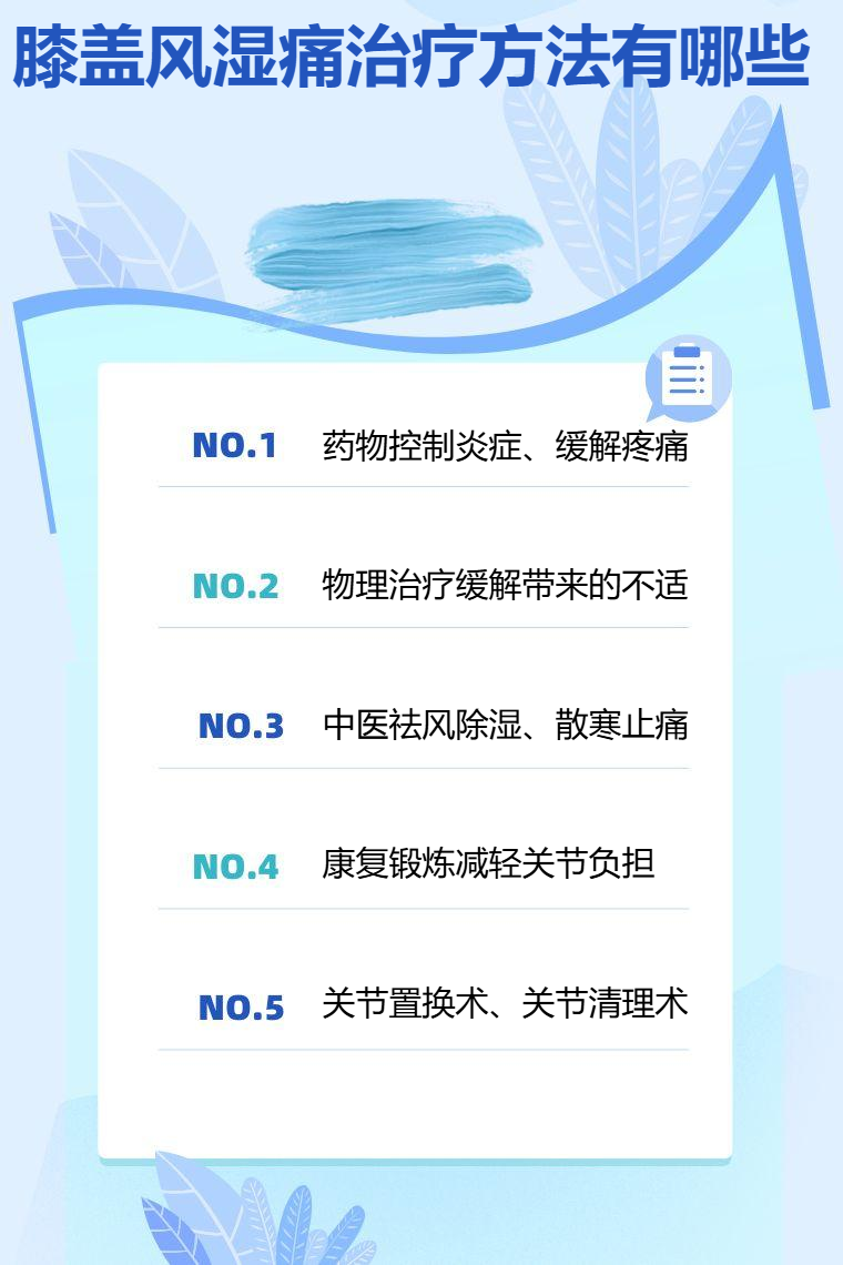 膝盖风湿痛的治疗方法有药物治疗、物理治疗、中医治疗、康复锻炼、手术治疗等。