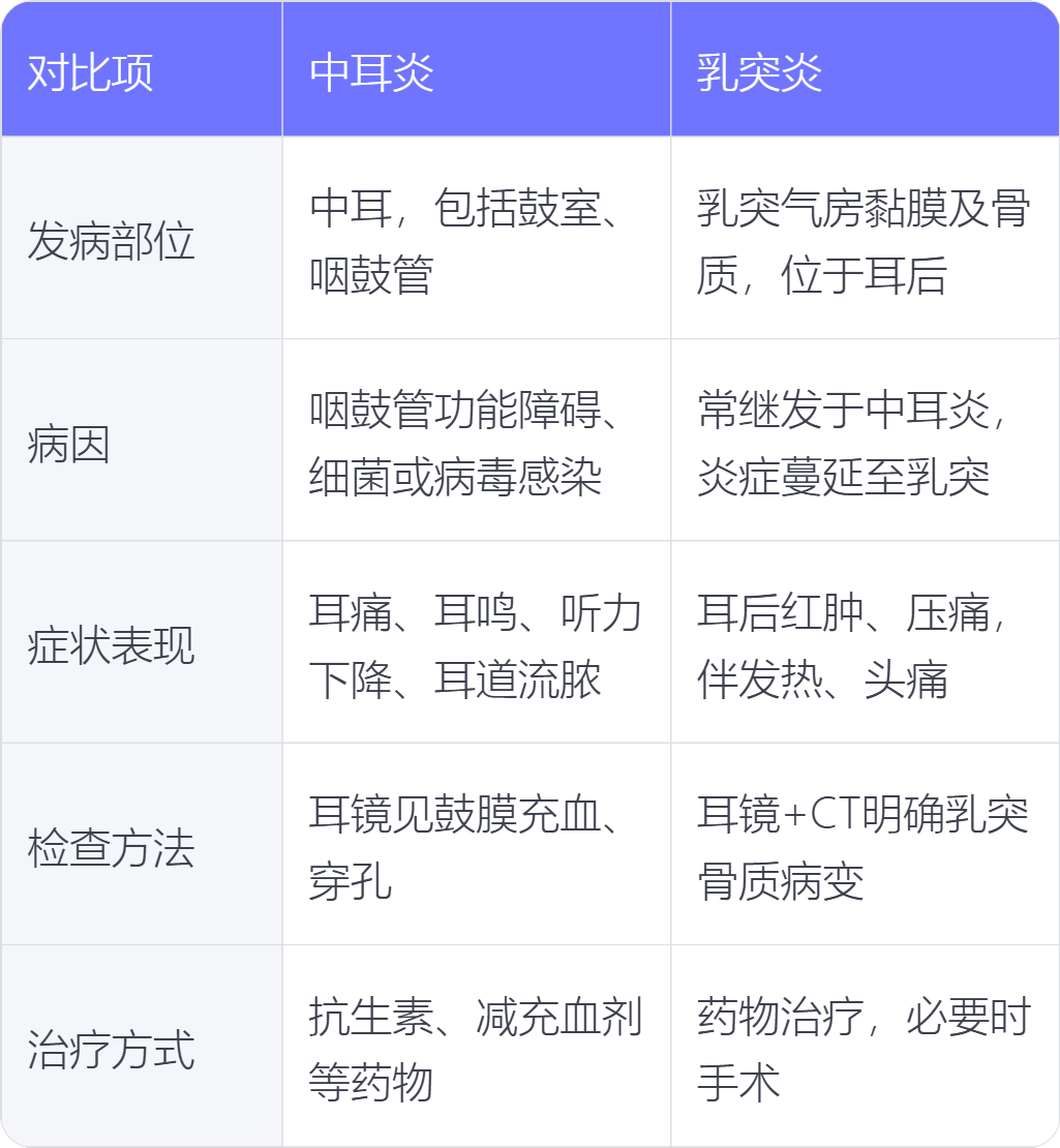 中耳炎和乳突炎在发病部位、病因、症状表现、检查方法、治疗方式上存在不同。