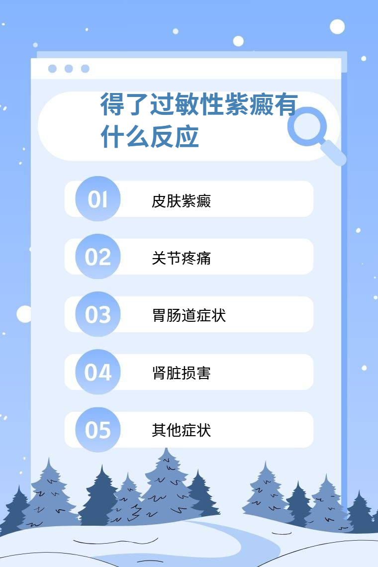 皮肤紫癜、关节疼痛、胃肠道症状、肾脏损害、其他症状等是过敏性紫癜常见的反应。