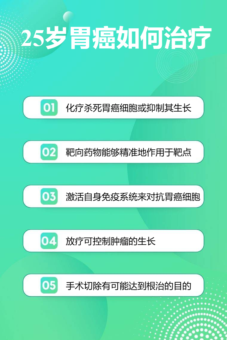 25岁胃癌的治疗方法主要有化疗、靶向治疗、免疫治疗、放疗、手术治疗等。