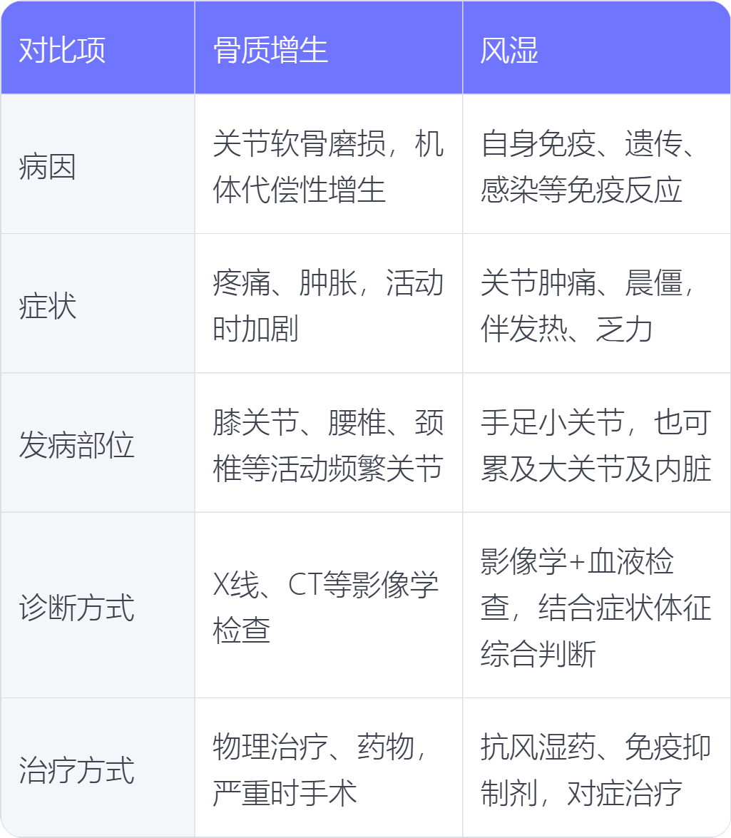骨质增生和风湿在病因、症状、发病部位、诊断方式、治疗方式上存在不同。