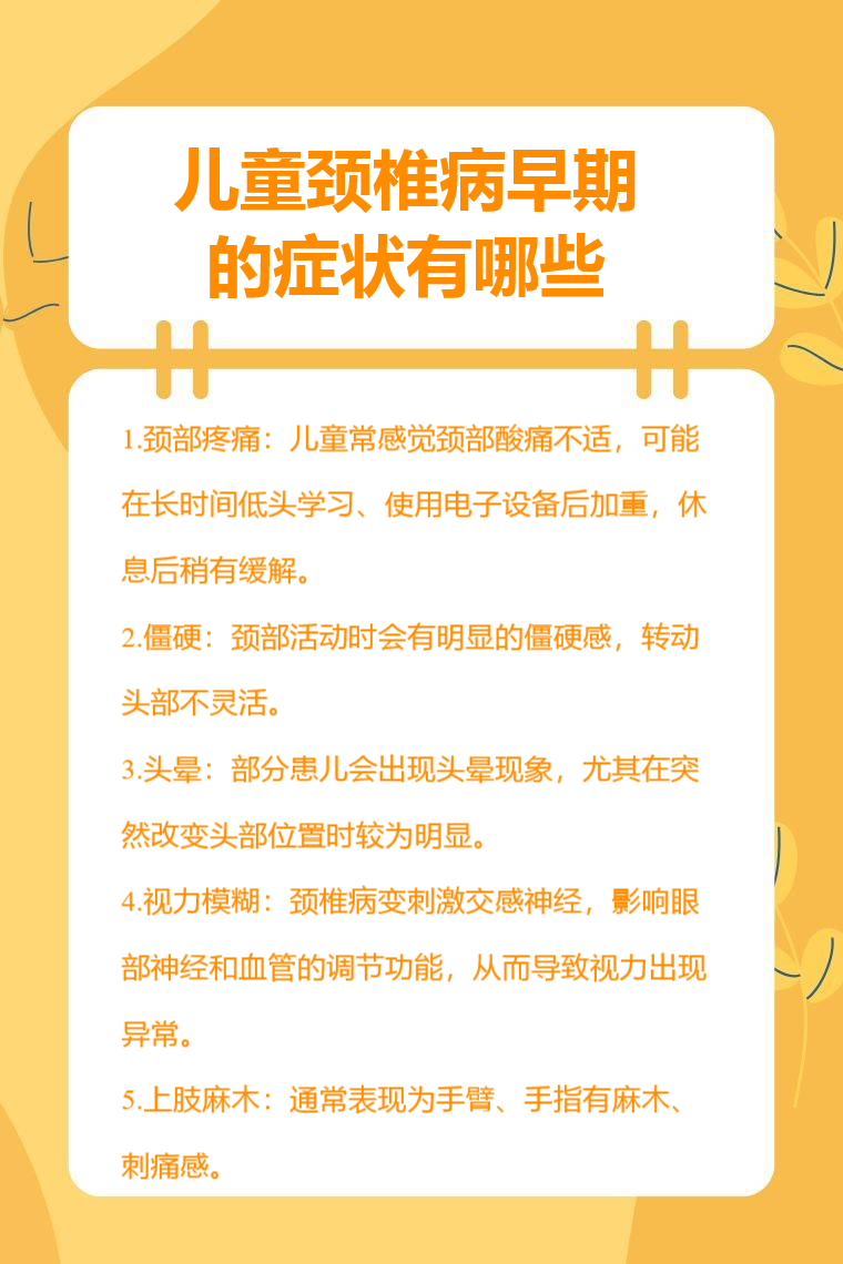 儿童颈椎病早期症状有颈部疼痛、僵硬、头晕、视力模糊、上肢麻木等。