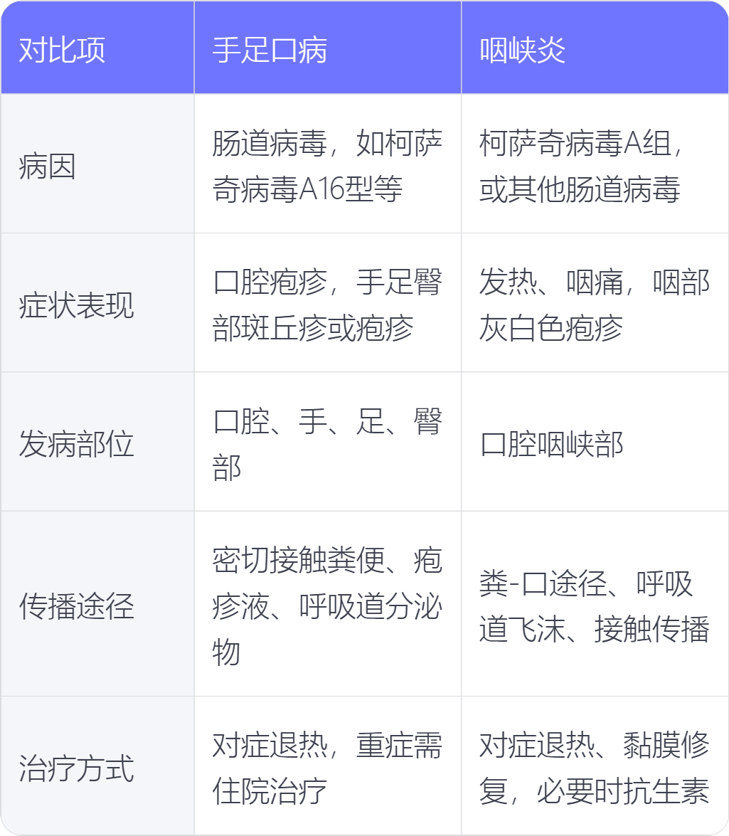 手足口病与咽峡炎在病因、症状表现、发病部位、传播途径、治疗方式上存在不同。