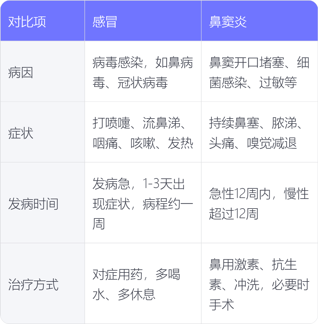 感冒和鼻窦炎可从病因、症状、发病时间、治疗方式来区分。
