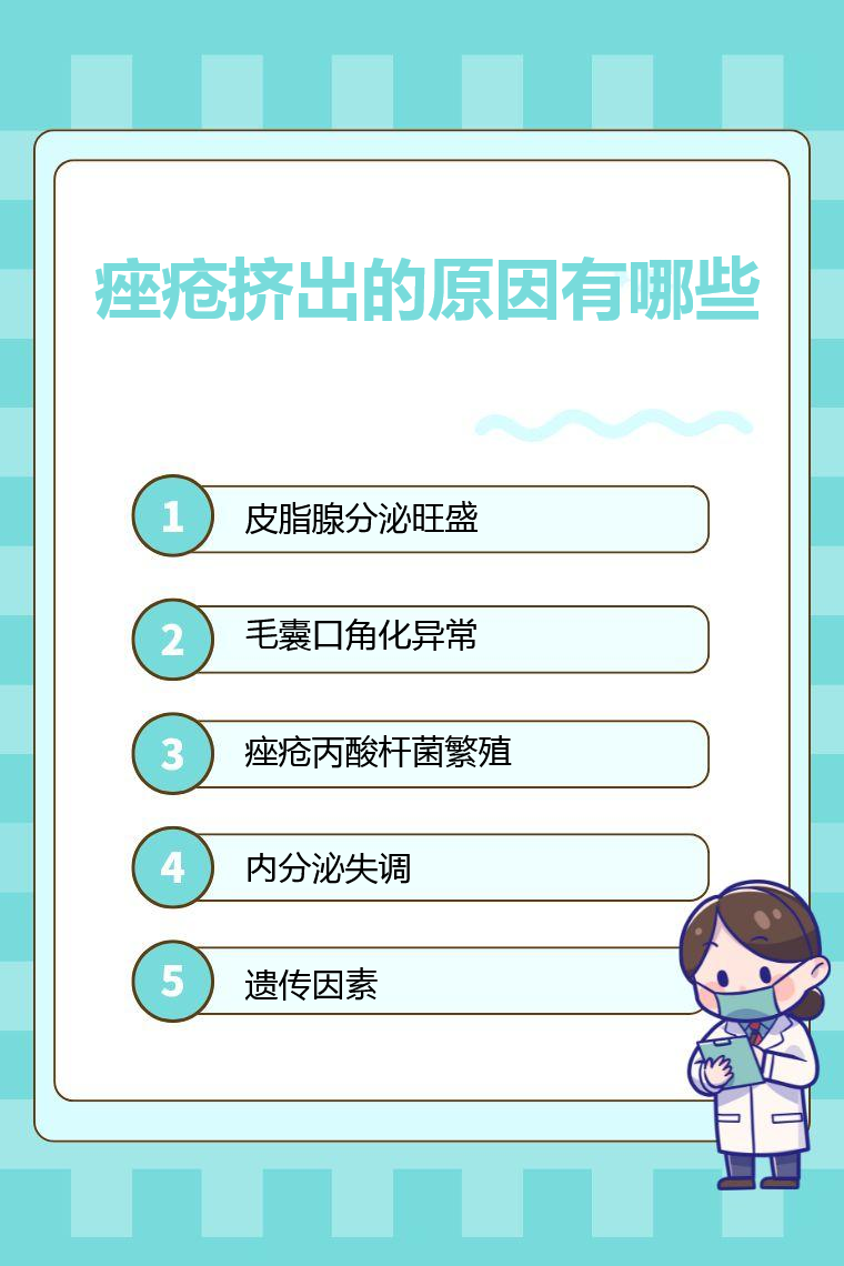 痤疮挤出的原因有皮脂腺分泌旺盛、毛囊口角化异常、痤疮丙酸杆菌繁殖、内分泌失调、遗传因素等。