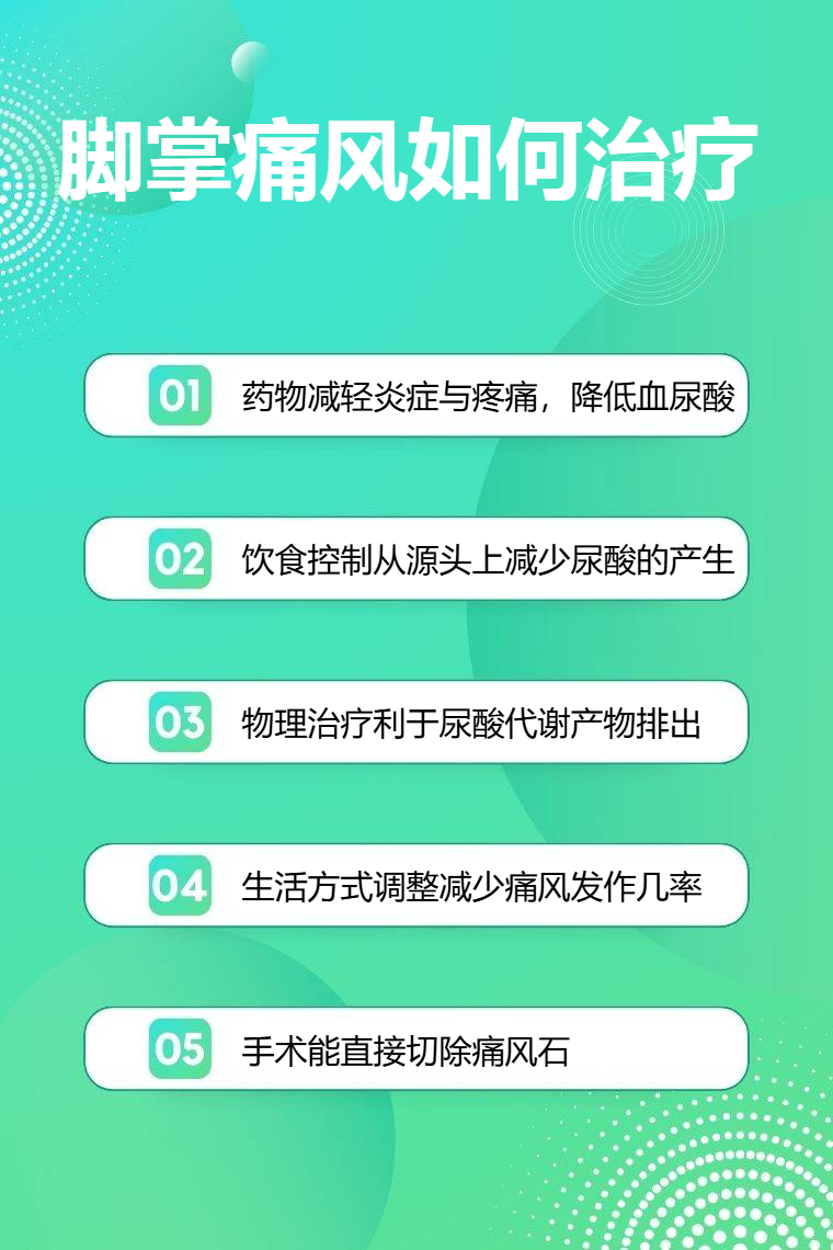 脚掌痛风的治疗方法主要有药物治疗、饮食控制、物理治疗、生活方式调整、手术治疗等。