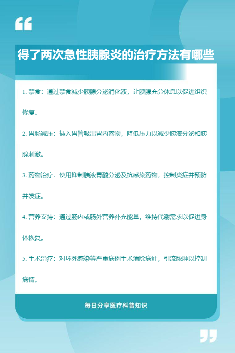 得了两次急性胰腺炎可通过禁食、胃肠减压、药物治疗、营养支持、手术治疗等方法进行治疗。