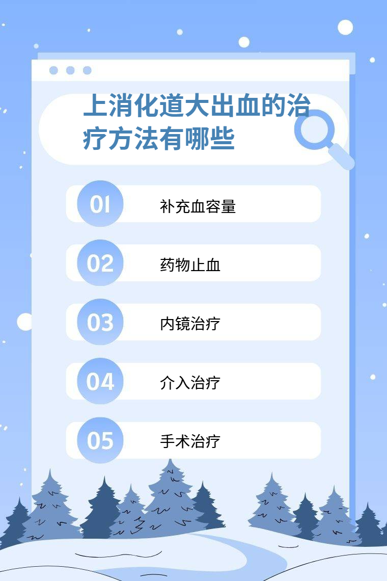 上消化道大出血的治疗方法有补充血容量、药物止血、内镜治疗、介入治疗、手术治疗等。