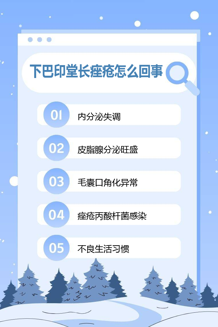 1. 内分泌失调:体内激素水平失衡,雄激素分泌增加,会刺激皮脂腺增大、皮脂分泌增多,导致毛囊堵塞,进而引发痤疮,在下巴和印堂部位出现。青春期、生理期等特殊时期,激素波动较大,更容易出现这种情况。