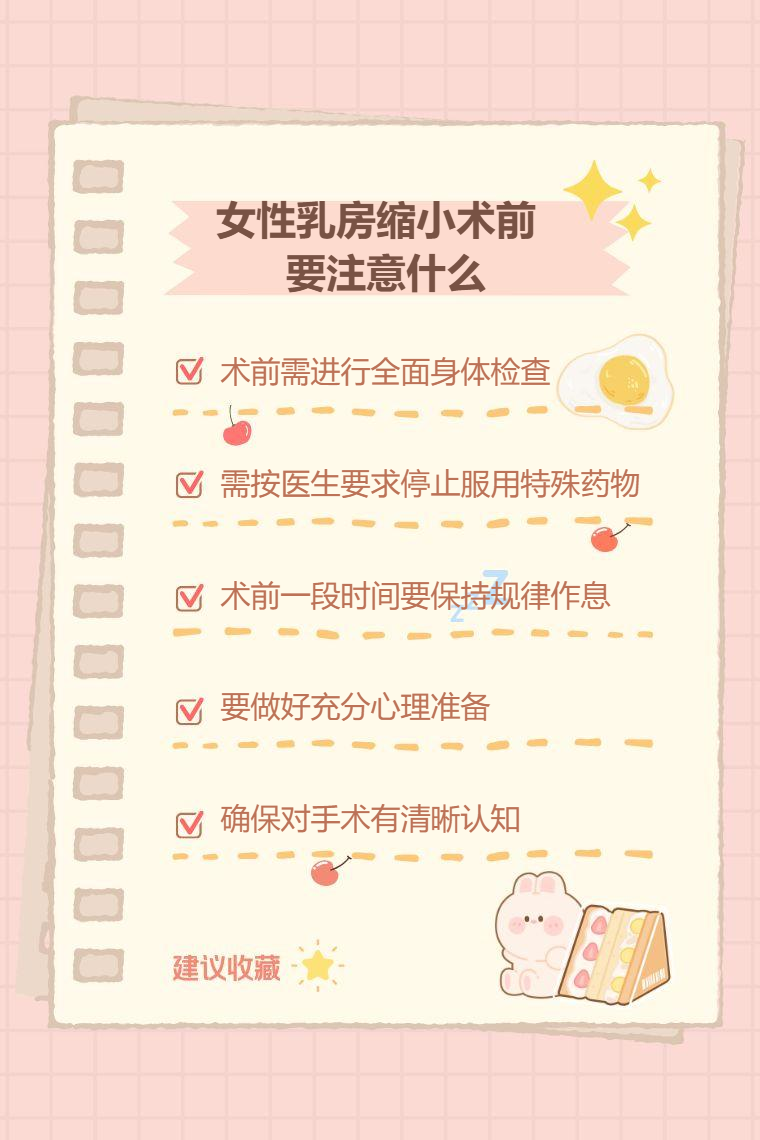 女性乳房缩小术前要注意身体检查、停止特殊药物服用、调整生活习惯、心理准备、与医生沟通等。