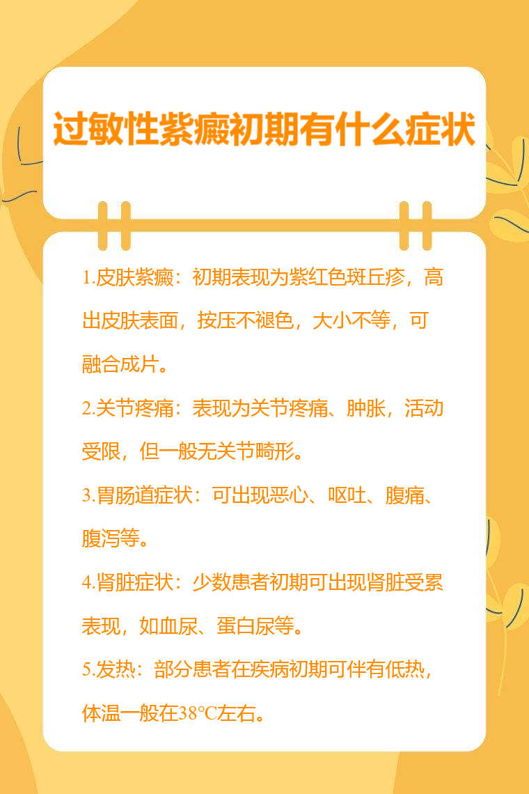 过敏性紫癜初期症状有皮肤紫癜、关节疼痛、胃肠道症状、肾脏症状、发热等。