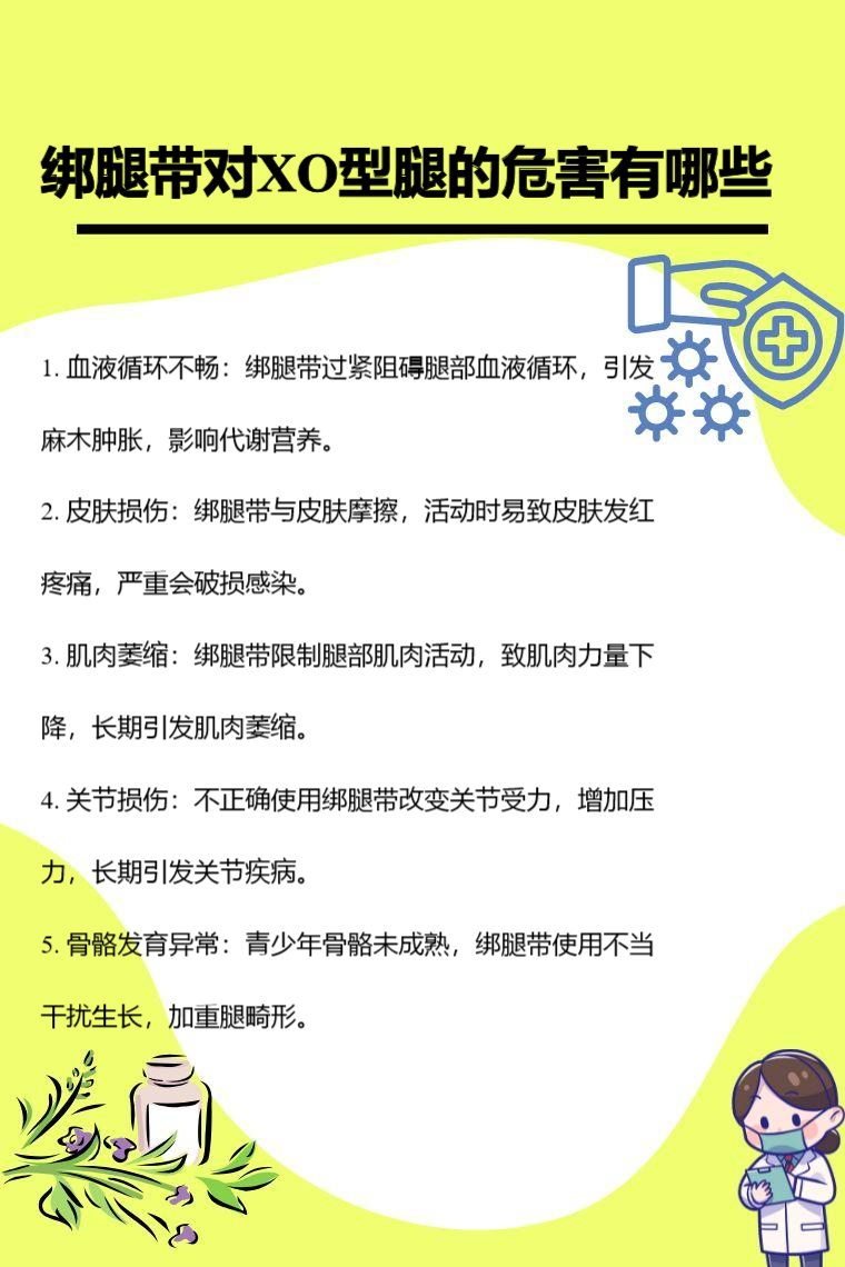 绑腿带对XO型腿可能造成血液循环不畅、皮肤损伤、肌肉萎缩、关节损伤、骨骼发育异常等危害。