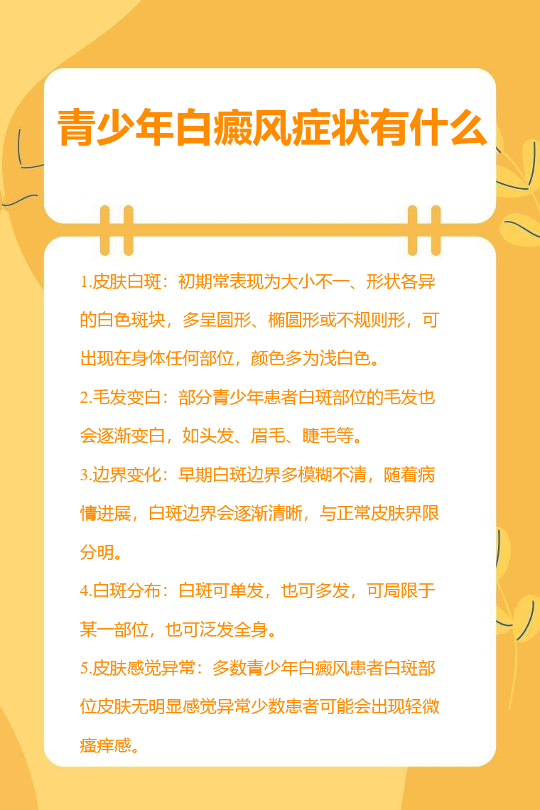 青少年白癜风症状有皮肤白斑、毛发变白、边界变化、白斑分布、皮肤感觉异常等。