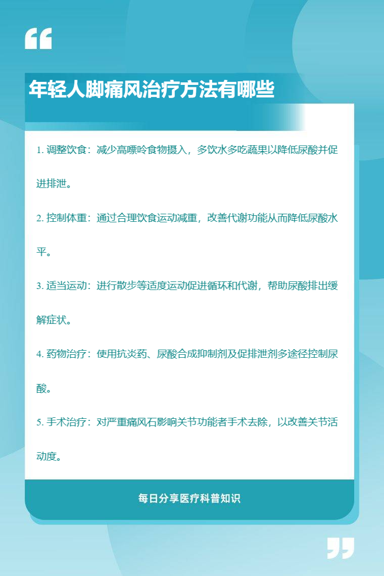 年轻人脚痛风的治疗方法有调整饮食、控制体重、适当运动、药物治疗、手术治疗等。