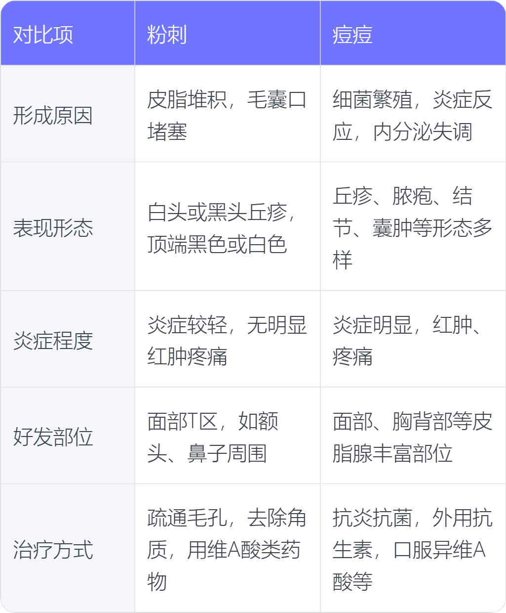 粉刺和痘痘在形成原因、表现形态、炎症程度、好发部位、治疗方式上存在不同。