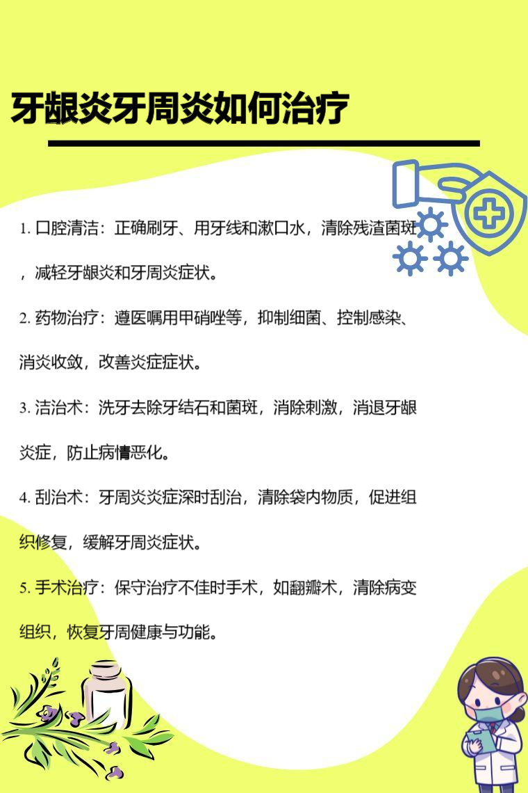 牙龈炎和牙周炎的治疗方法主要有口腔清洁、药物治疗、洁治术、刮治术、手术治疗等。