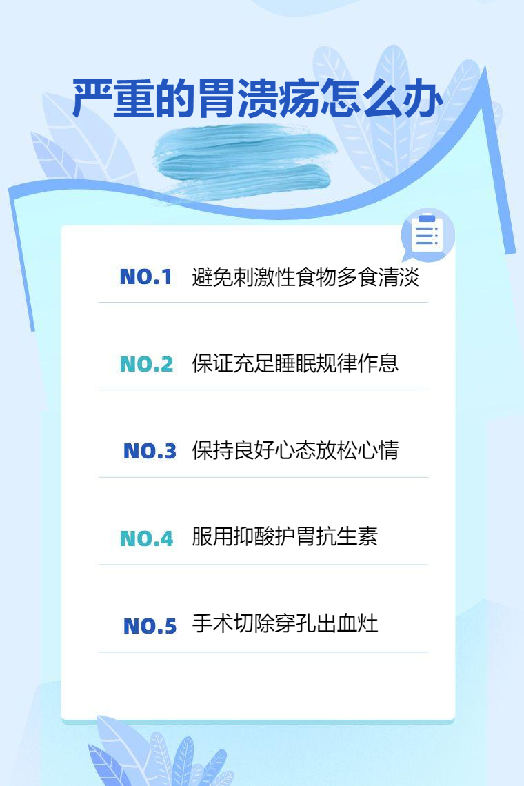 严重的胃溃疡可通过调整饮食、规律作息、心理调节、药物治疗、手术治疗等方法应对。