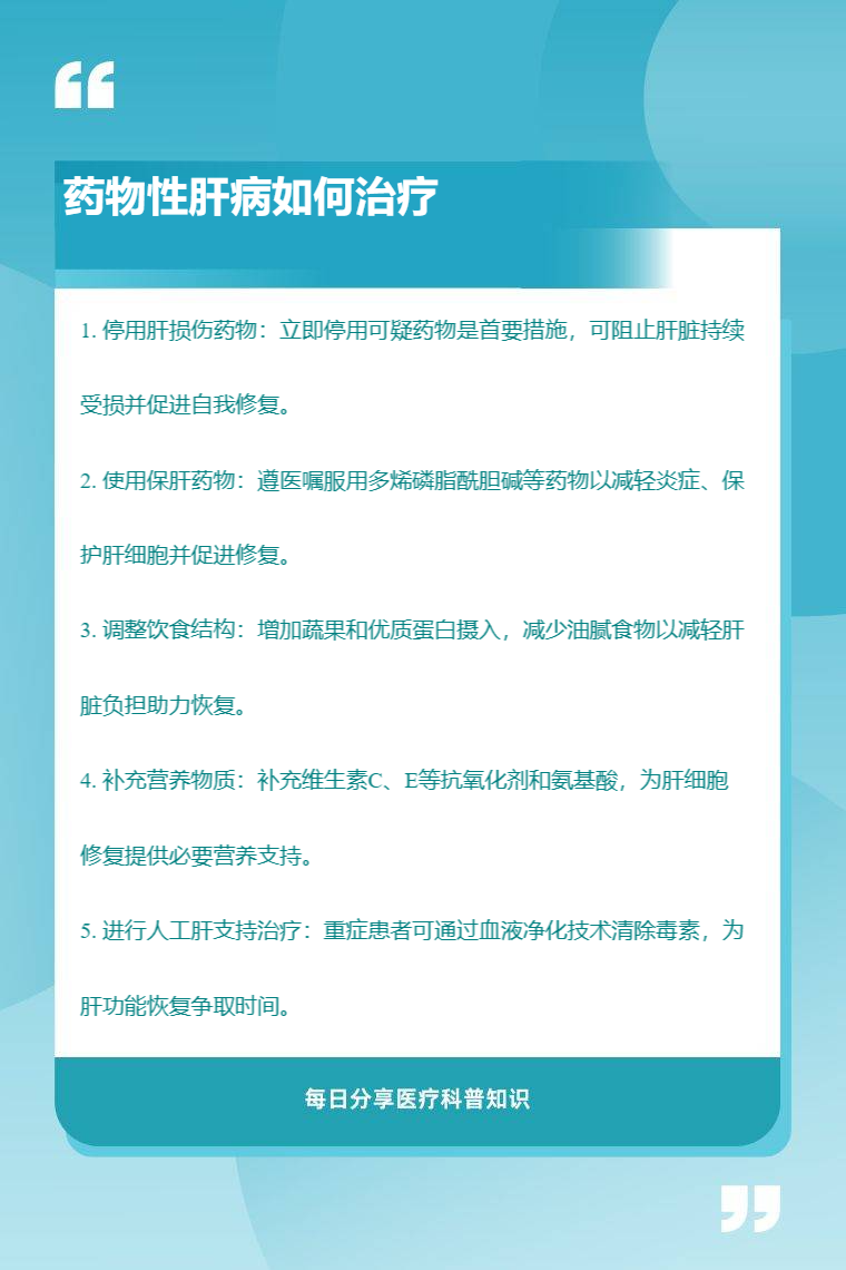 药物性肝病的治疗方法主要有停用肝损伤药物、使用保肝药物、调整饮食结构、补充营养物质、进行人工肝支持治疗等。