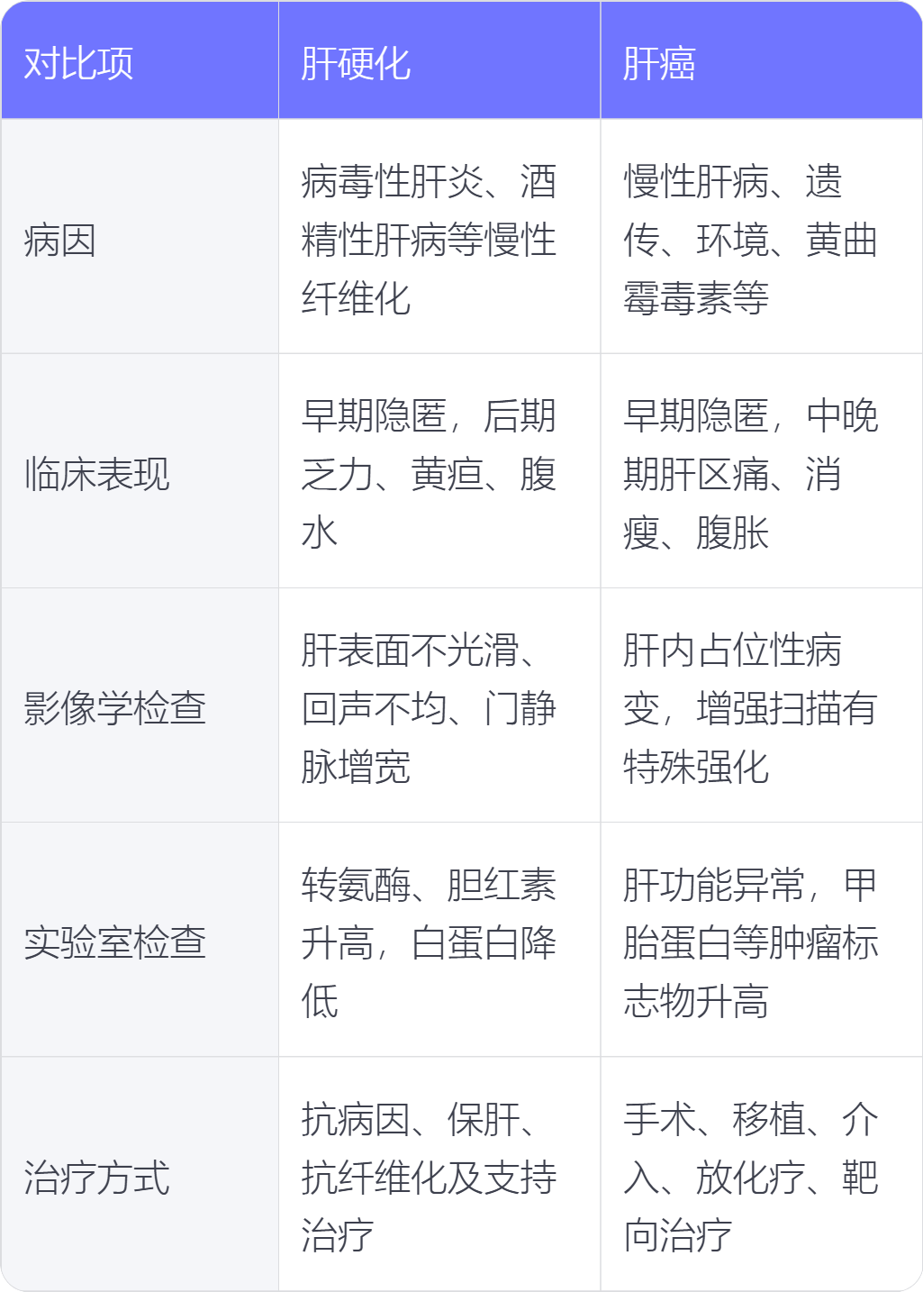 5. 治疗方式:肝硬化主要是针对病因治疗,如抗病毒、戒酒等,同时进行保肝、抗纤维化及对症支持治疗;肝癌的治疗则根据病情采取手术切除、肝移植、介入治疗、放疗、化疗、靶向治疗等多种手段。