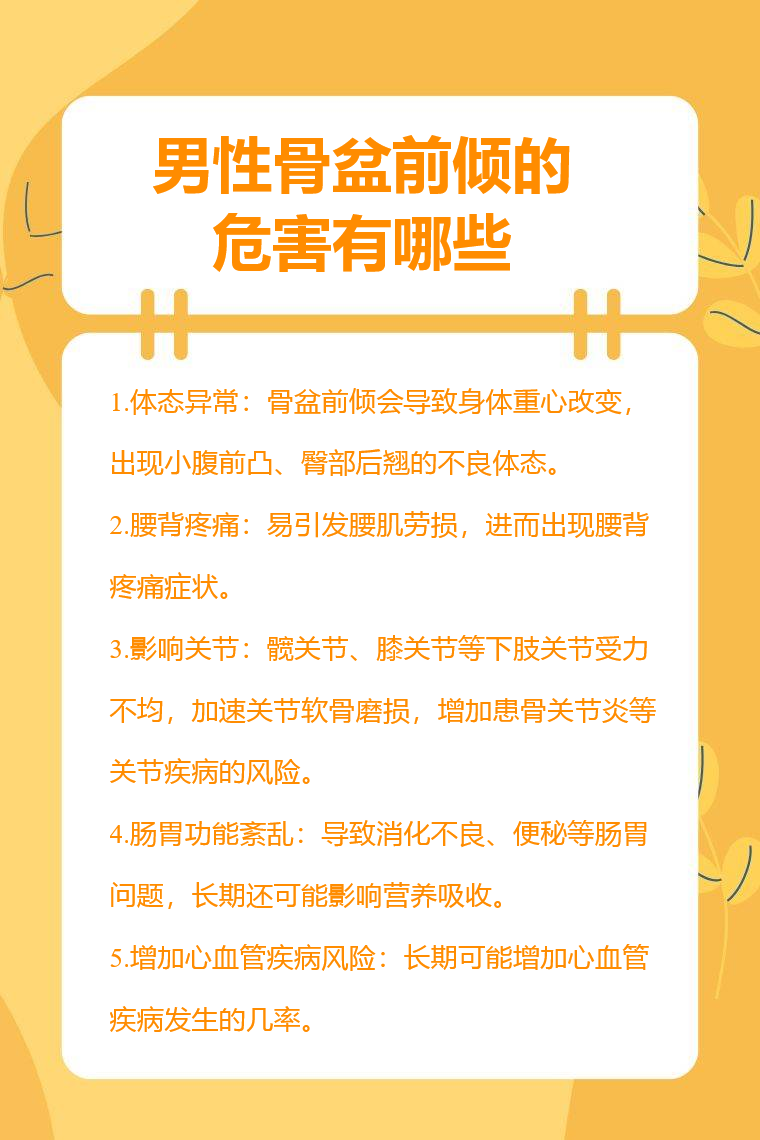 男性骨盆前倾的危害有体态异常、腰背疼痛、影响关节、肠胃功能紊乱、增加心血管疾病风险等。