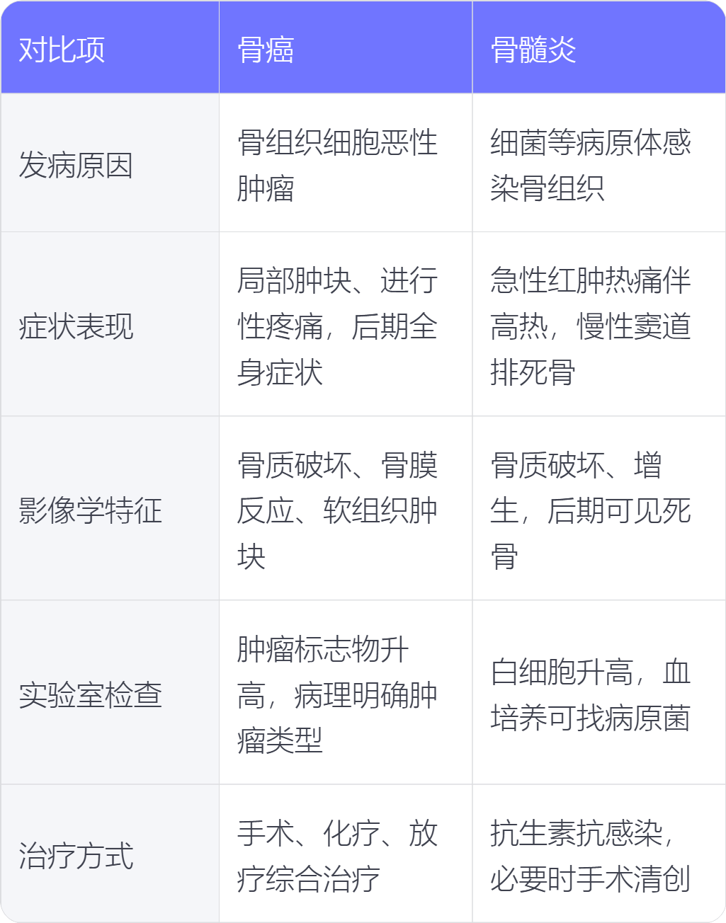 5. 治疗方式:骨癌多采用手术、化疗、放疗等综合治疗;骨髓炎主要以抗生素抗感染治疗为主,必要时进行手术清创引流。
