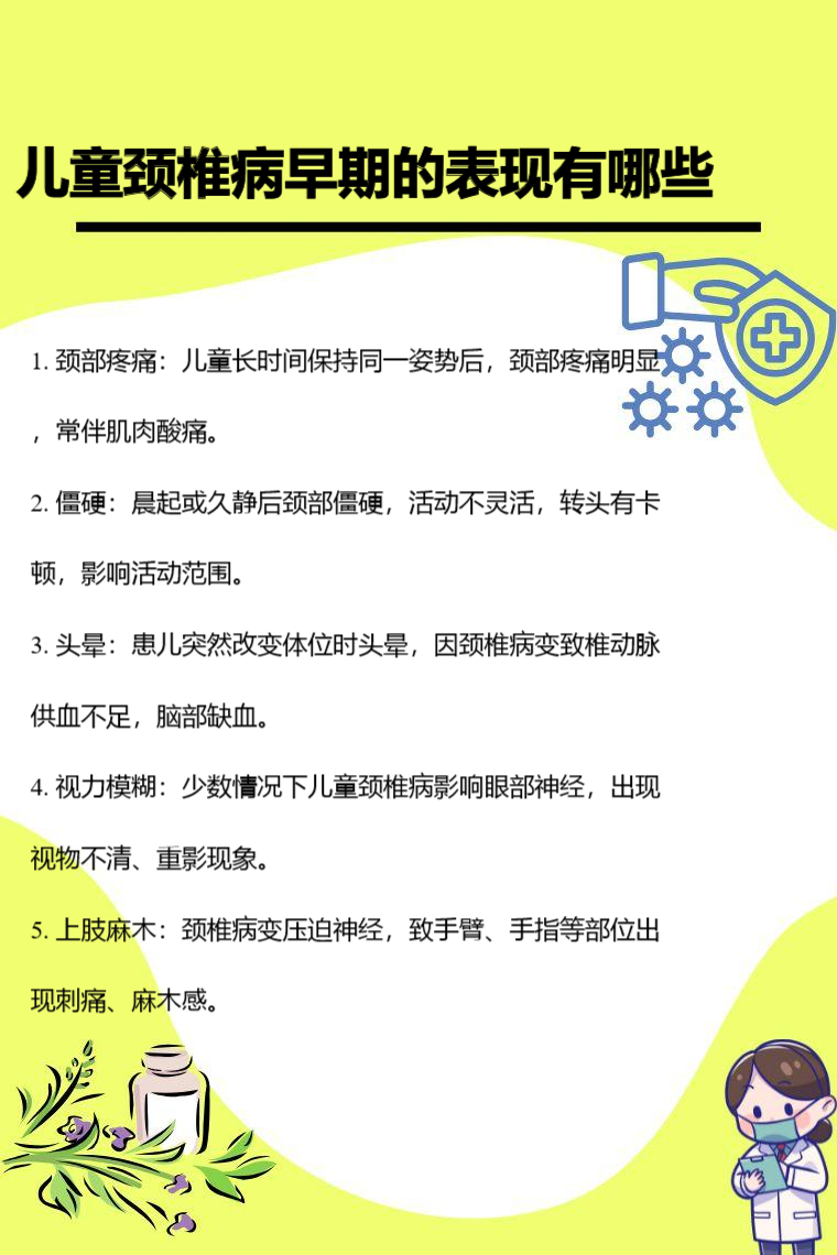 儿童颈椎病早期表现有颈部疼痛、僵硬、头晕、视力模糊、上肢麻木等。