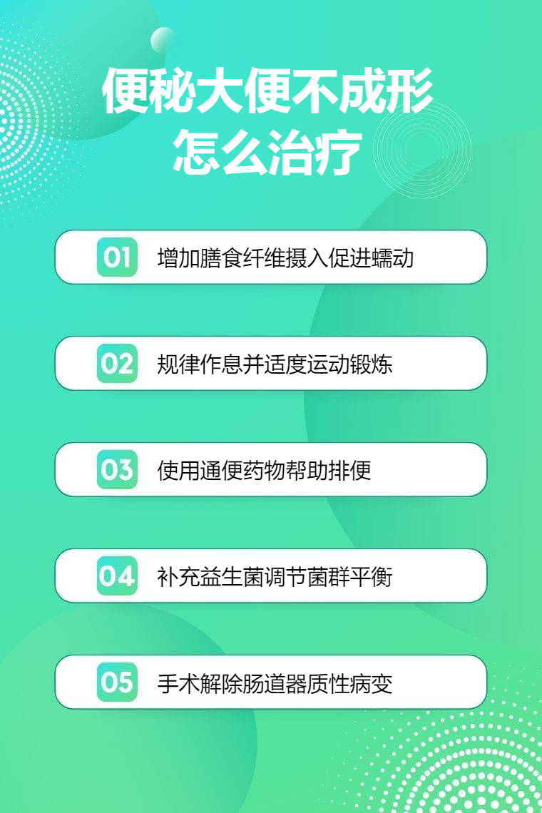 便秘大便不成形可通过饮食调整、生活方式改善、药物治疗、肠道菌群调节、手术治疗等方法来治疗。