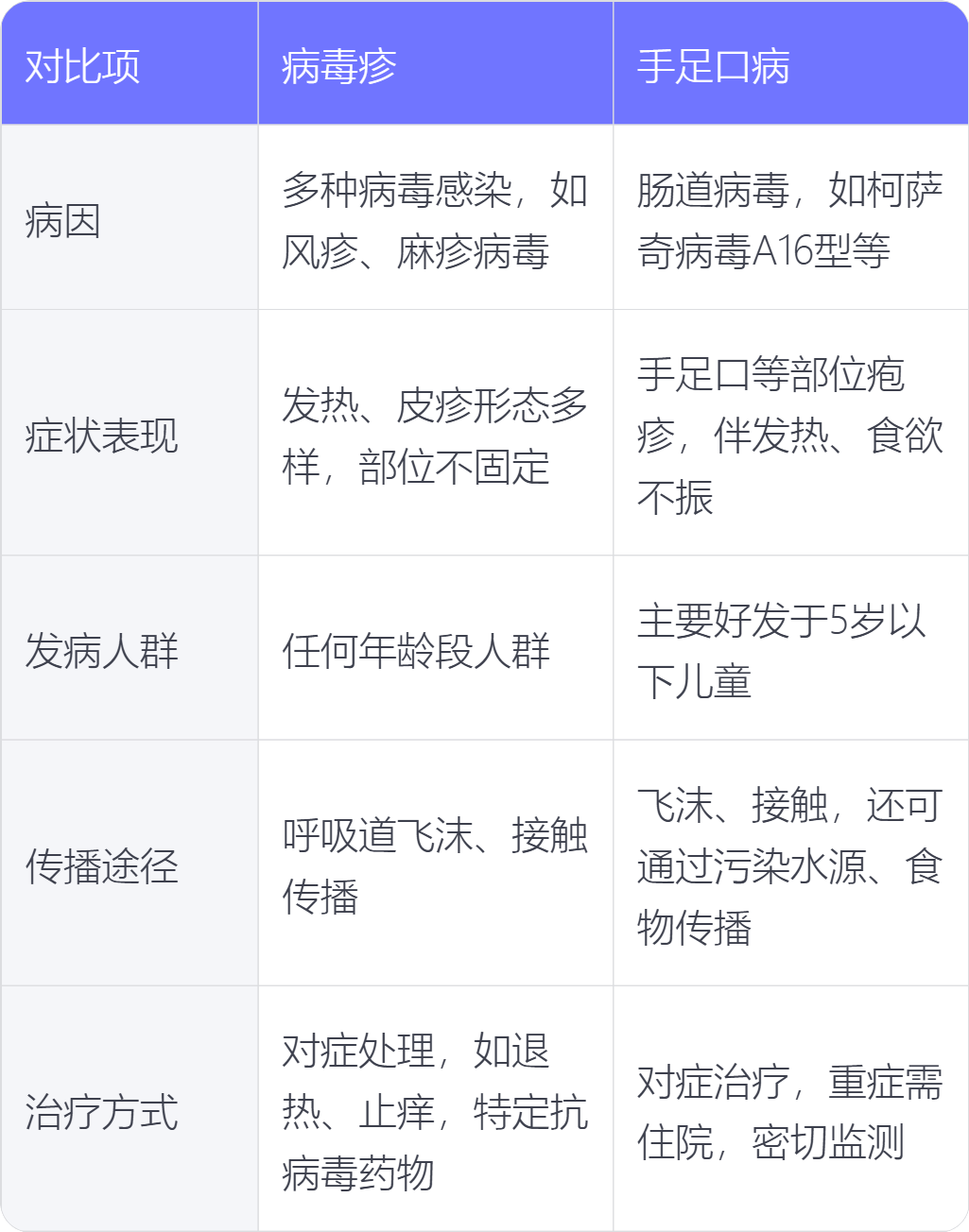 病毒疹与手足口病在病因、症状表现、发病人群、传播途径、治疗方式上存在不同。