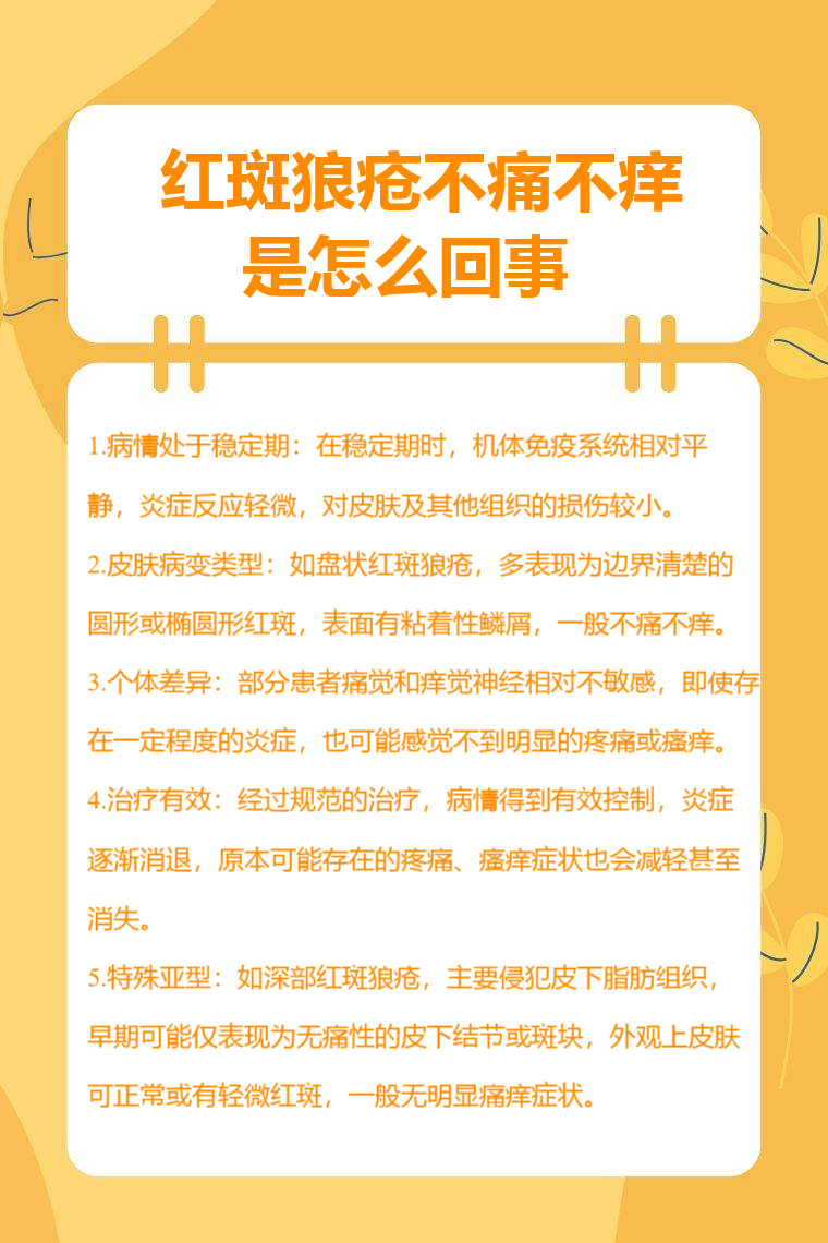 红斑狼疮不痛不痒可能与病情处于稳定期、皮肤病变类型、个体差异、治疗有效、特殊亚型等有关。