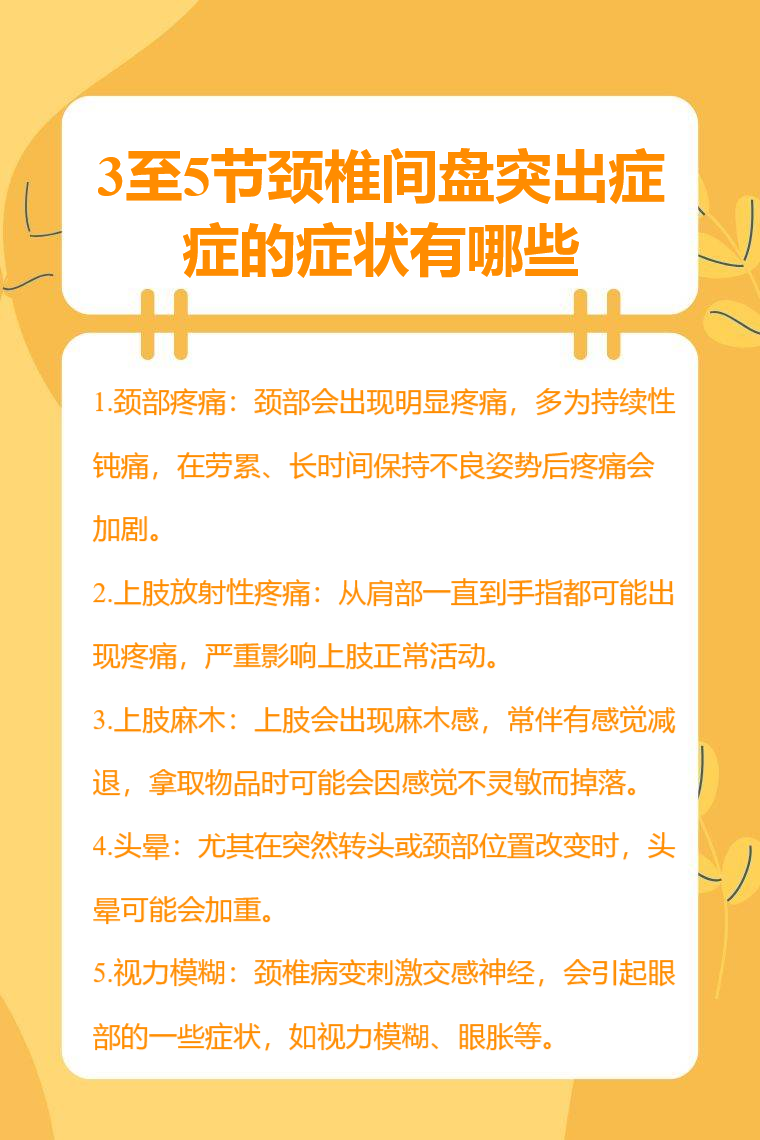3至5节颈椎间盘突出症的症状有颈部疼痛、上肢放射性疼痛、上肢麻木、头晕、视力模糊等。