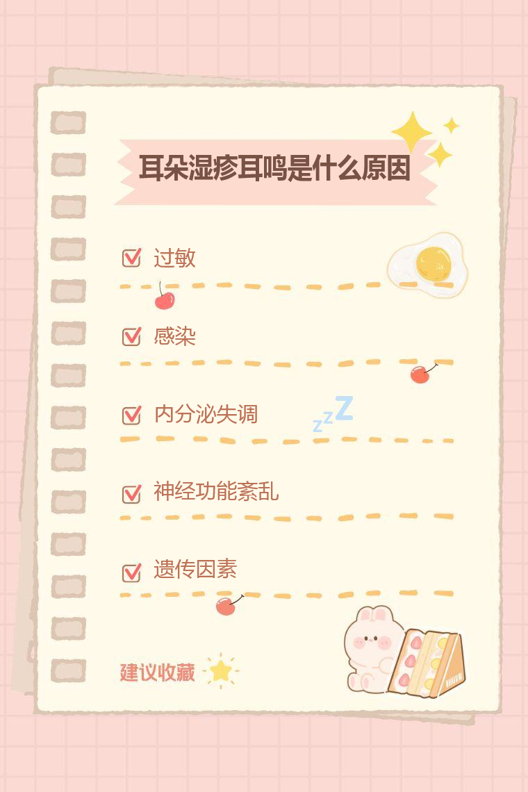 耳朵湿疹耳鸣的原因包括过敏、感染、内分泌失调、神经功能紊乱、遗传因素等。