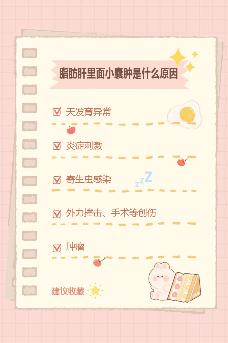 脂肪肝里面小囊肿的原因包括先天发育异常、炎症刺激、寄生虫感染、创伤、肿瘤等。