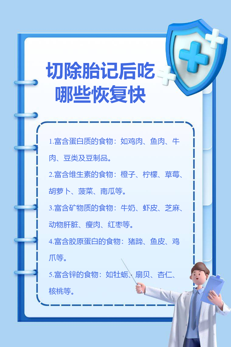切除胎记后患者可通过摄入富含蛋白质、维生素、矿物质、胶原蛋白、锌等营养物质的食物促进恢复等。