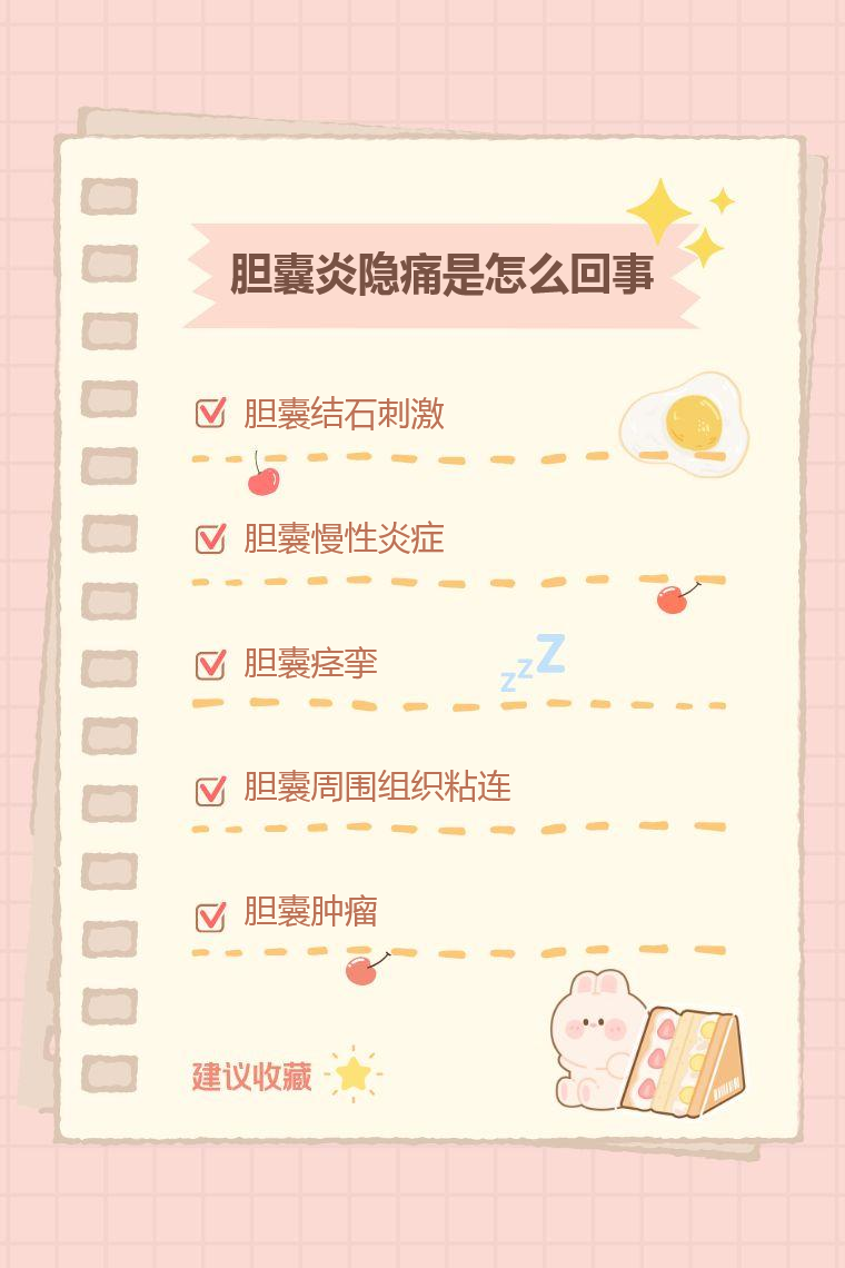 胆囊炎隐痛常见原因有胆囊结石刺激、胆囊慢性炎症、胆囊痉挛、胆囊周围组织粘连、胆囊肿瘤等。