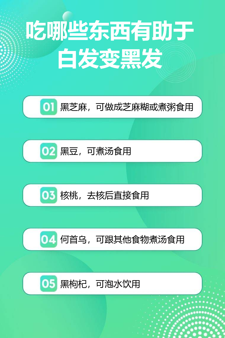 吃黑芝麻、黑豆、核桃、何首乌、黑枸杞等有助于白发变黑发。