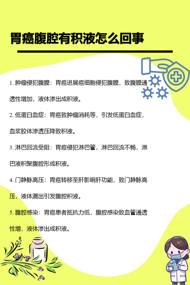 2. 低蛋白血症:胃癌患者由于肿瘤消耗、食欲减退、消化吸收功能障碍等原因,容易出现低蛋白血症。血液中白蛋白水平降低,导致血浆胶体渗透压下降,血管内的液体就会漏出到组织间隙和腹腔,从而产生腹腔积液。