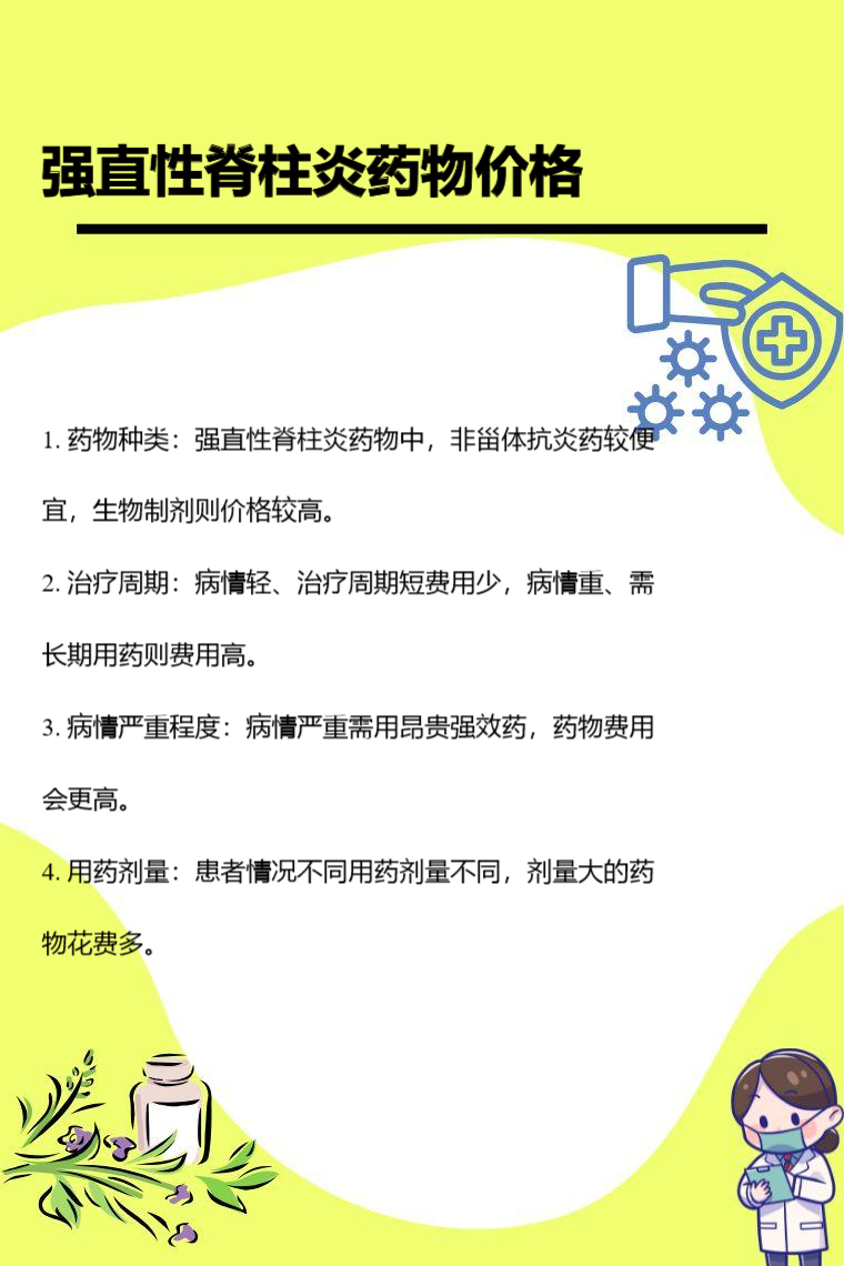 1. 药物种类:不同类型的强直性脊柱炎药物价格不同,如非甾体抗炎药相对价格较低,可能几百元一个月,而生物制剂价格普遍较高,每月可能数千元。