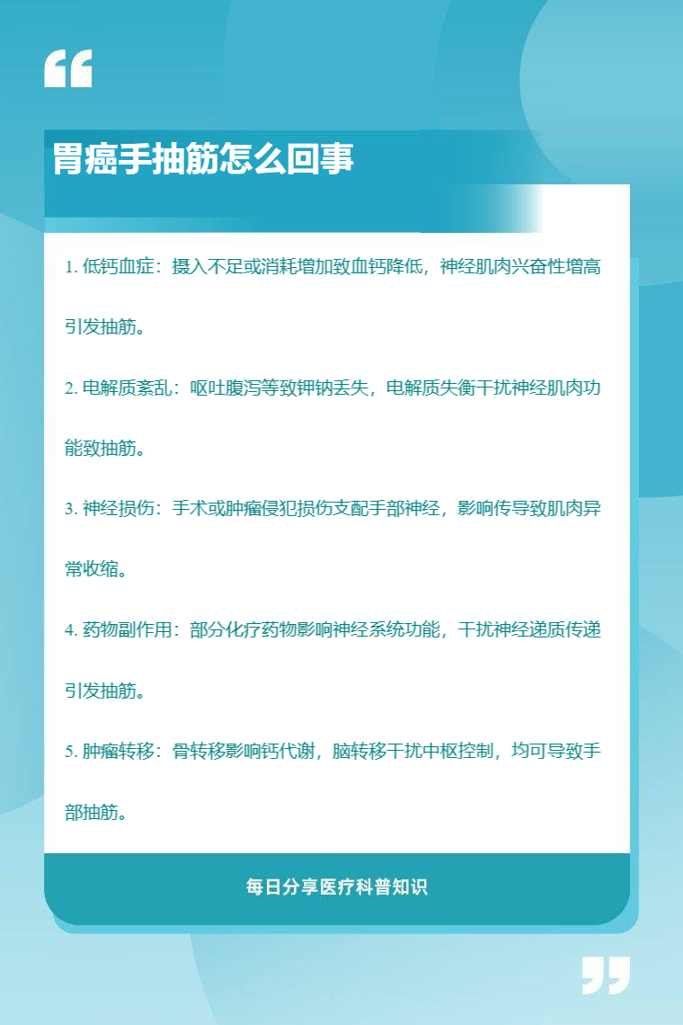 胃癌手抽筋可能是低钙血症、电解质紊乱、神经损伤、药物副作用、肿瘤转移等情况等。