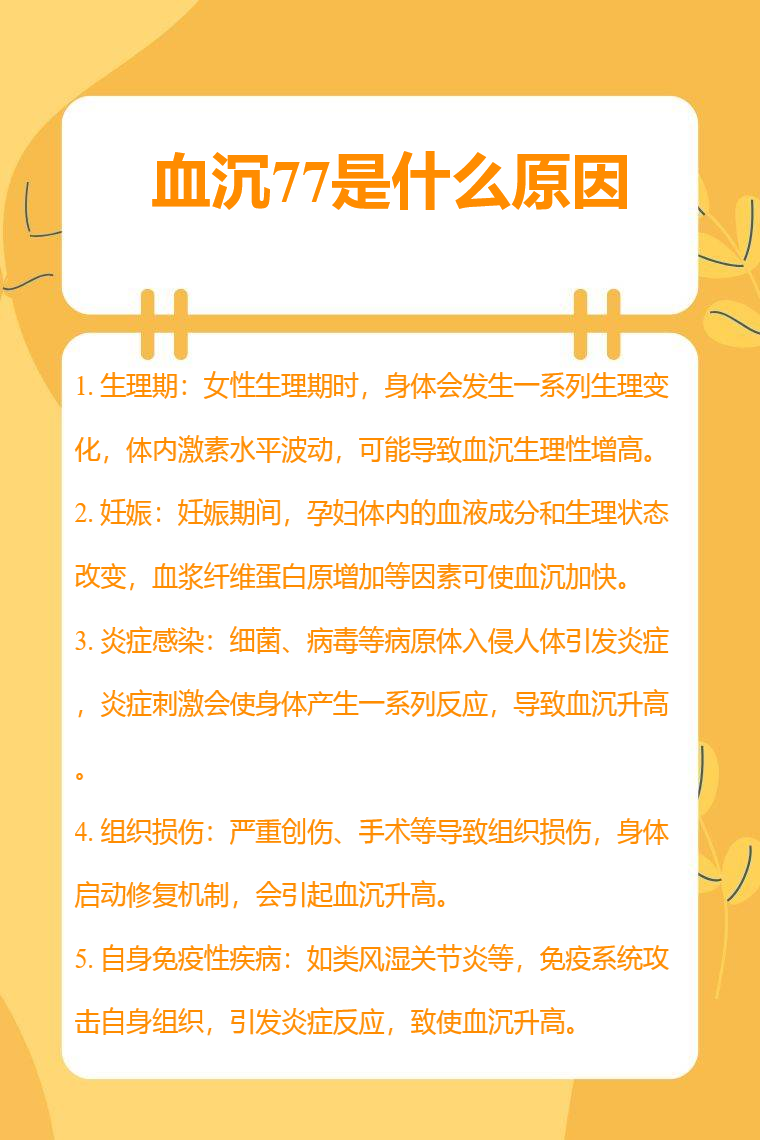 血沉77可能是由生理期、妊娠、炎症感染、组织损伤、自身免疫性疾病等原因导致。