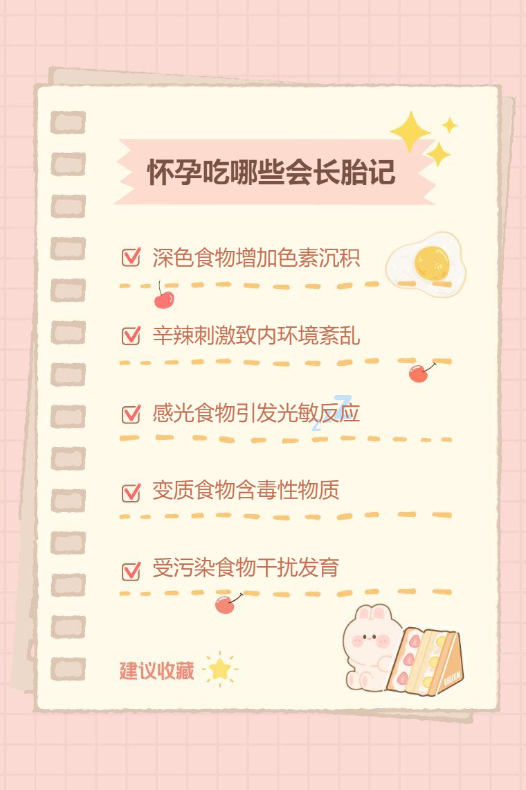 孕期食用色素含量高食物、辛辣食物、感光食物、变质食物、受污染食物等可能与胎记形成有关。