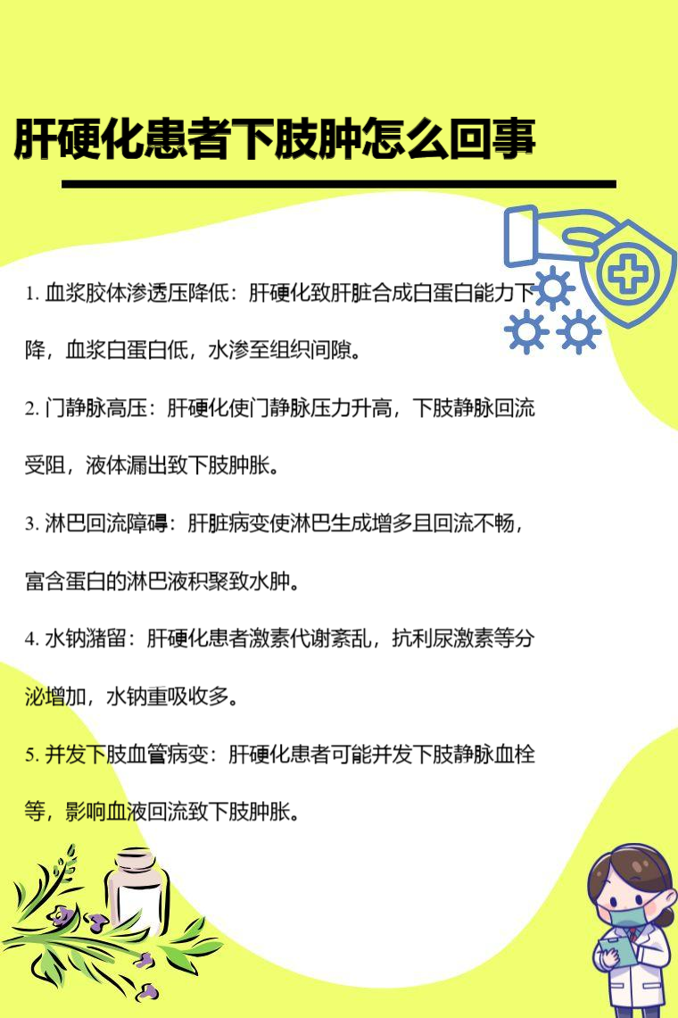 肝硬化患者下肢肿常见原因有血浆胶体渗透压降低、门静脉高压、淋巴回流障碍、水钠潴留、并发下肢血管病变等。