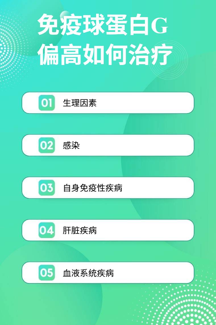 免疫球蛋白 G 偏高可能是生理因素、感染、自身免疫性疾病、肝脏疾病、血液系统疾病等因素,需要针对病因治疗,可采取的方法有调整生活方式、抗感染、免疫抑制、治疗基础疾病等。