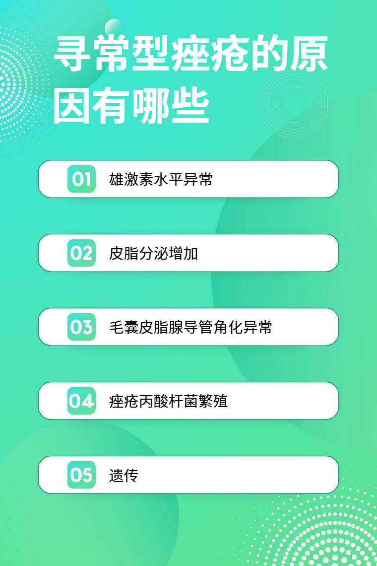 寻常型痤疮的原因有雄激素水平异常、皮脂分泌增加、毛囊皮脂腺导管角化异常、痤疮丙酸杆菌繁殖、遗传等。