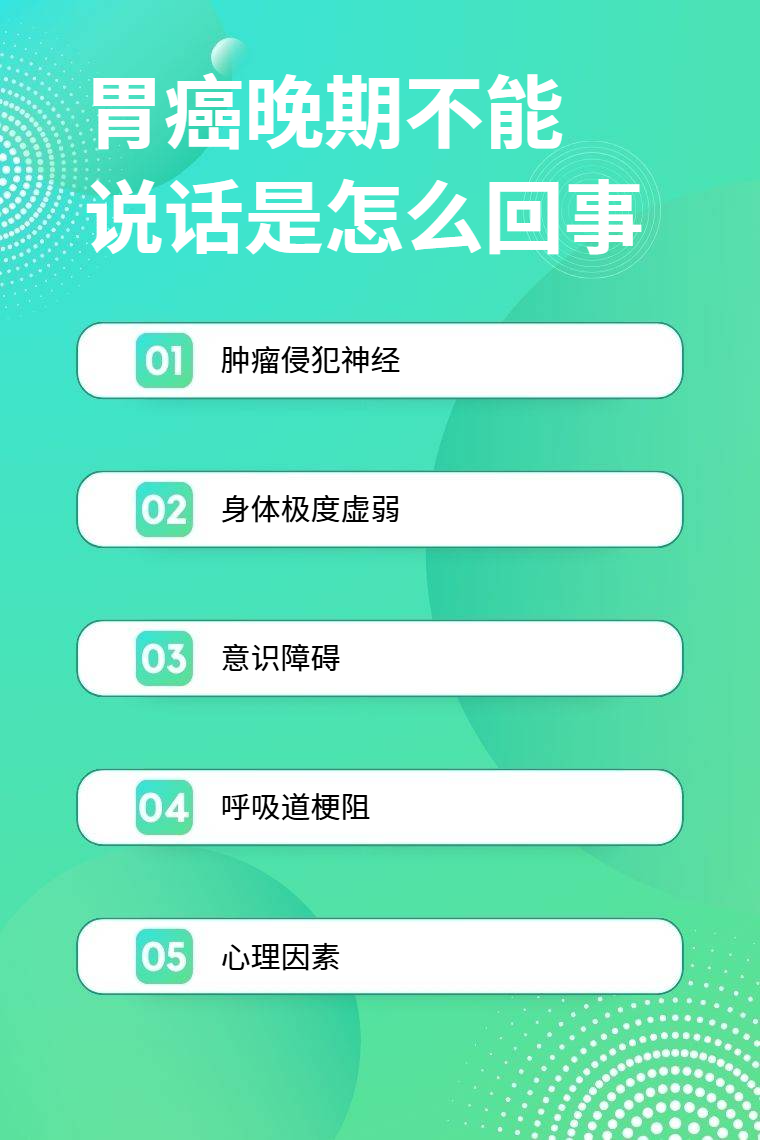 1. 肿瘤侵犯神经:胃癌晚期肿瘤可能发生转移,若转移至脑部,侵犯支配语言功能的神经区域,会影响语言中枢正常运作,导致无法正常说话;或者肿瘤侵犯颈部神经,影响声带运动,使声带无法正常开合振动发声。
