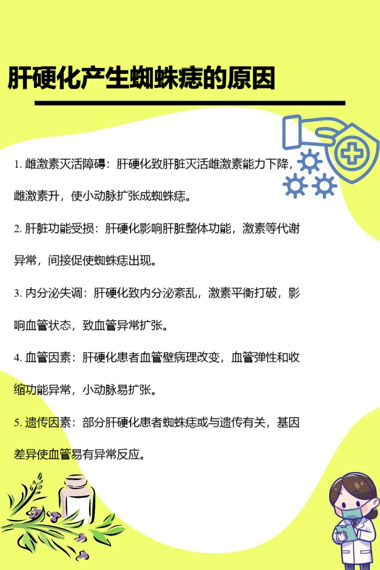 4. 血管因素:肝硬化患者的血管壁可能发生一些病理改变,导致血管的弹性和收缩功能异常。小动脉更容易出现扩张现象,在皮肤表面就表现为蜘蛛痣的形态。