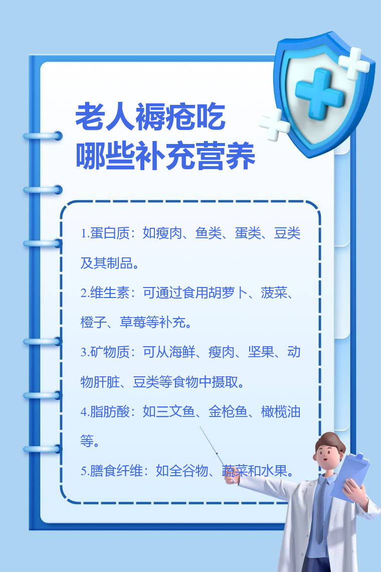老人褥疮时可补充蛋白质、维生素、矿物质、脂肪酸、膳食纤维等营养。