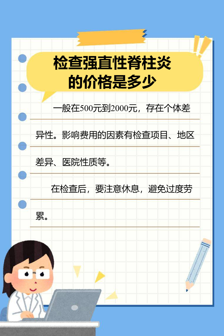 检查强直性脊柱炎的价格因多种因素而异,一般在500元到2000元,存在个体差异性。影响费用的因素有检查项目、地区差异、医院性质等。