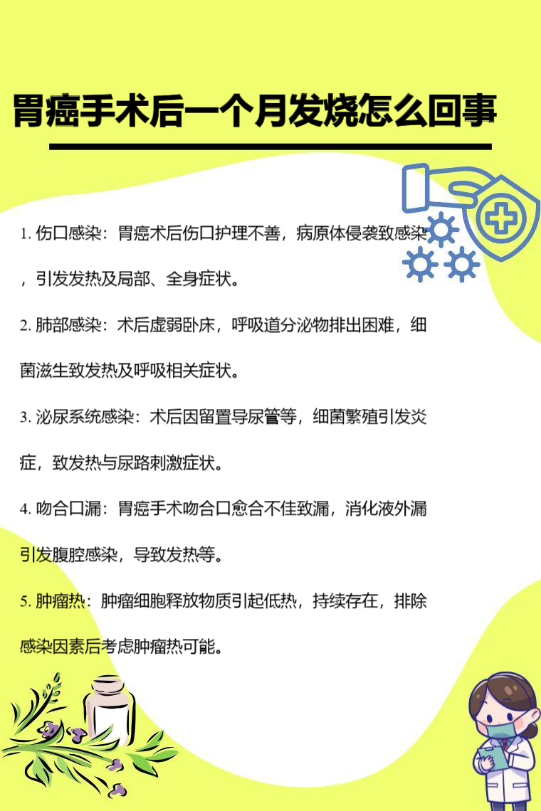 胃癌手术后一个月发烧可能是由于伤口感染、肺部感染、泌尿系统感染、吻合口漏、肿瘤热等。