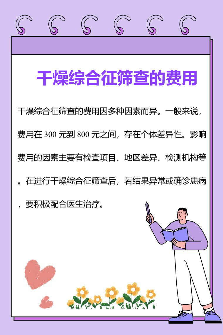 干燥综合征筛查的费用因多种因素而异。一般来说,费用在 300 元到 800 元之间,存在个体差异性。影响费用的因素主要有检查项目、地区差异、检测机构等。