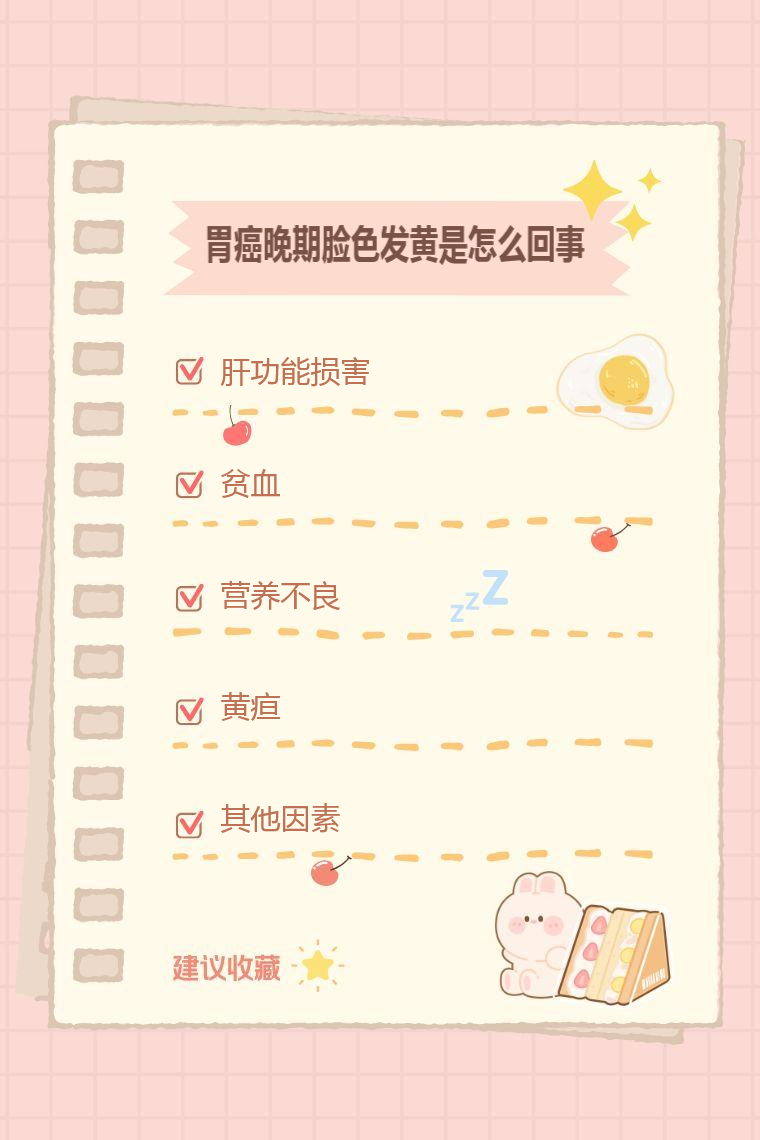 胃癌晚期脸色发黄常见原因有肝功能损害、贫血、营养不良、黄疸、其他因素等。